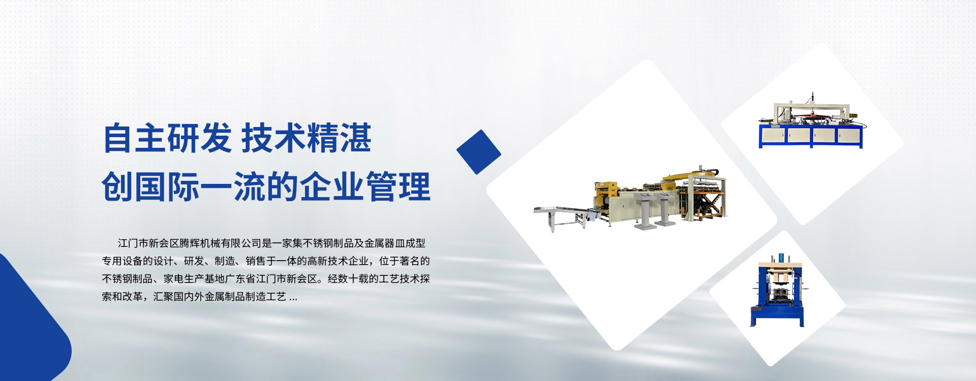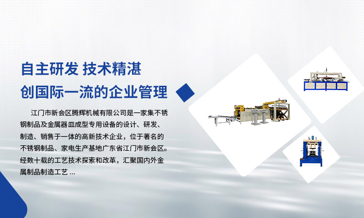 江門市新會(huì)區(qū)騰輝機(jī)械有限公司是一家集不銹鋼制品及金屬器皿成型專用設(shè)備的設(shè)計(jì)、研發(fā)、制造、銷售于一體的高新技術(shù)企業(yè),位于著名的不銹鋼制品、家電生產(chǎn)基地廣東省江門市新會(huì)區(qū)。經(jīng)數(shù)十載的工藝技術(shù)探索和改革,匯聚國內(nèi)外金屬制品制造工藝。